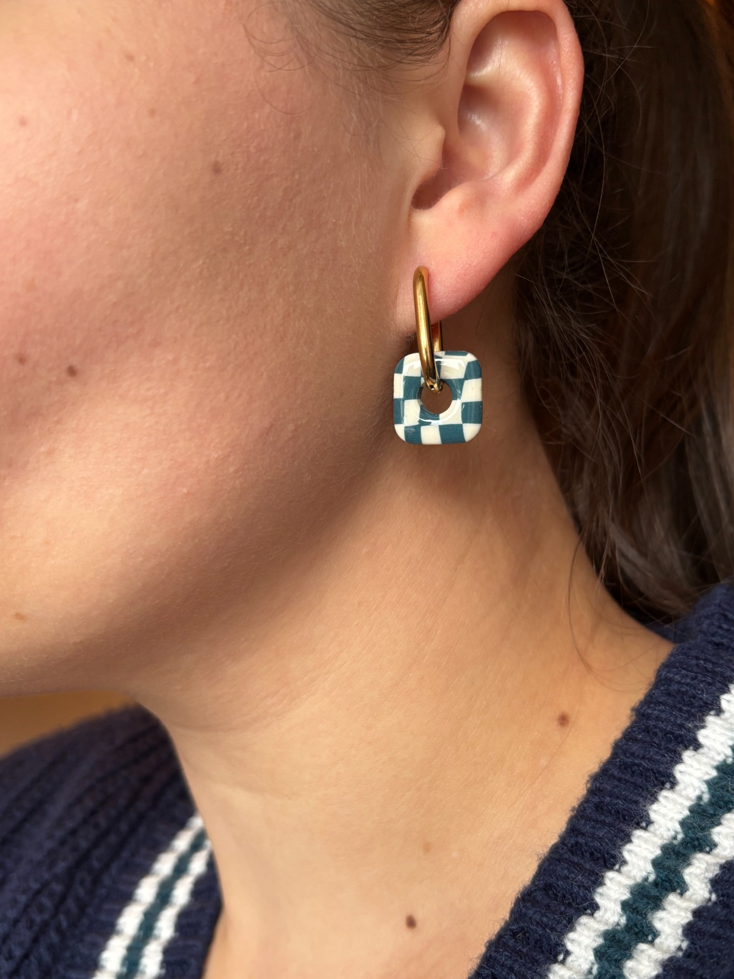 Odnímatelný přívěsek z polymerové hmoty dodává náušnicím hravost a možnost změny.