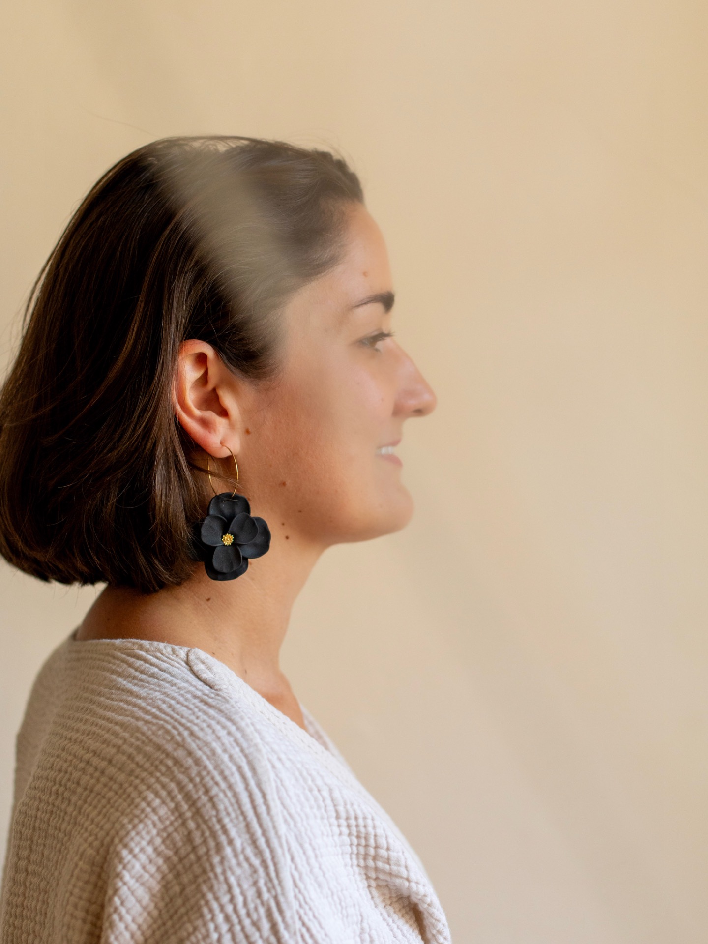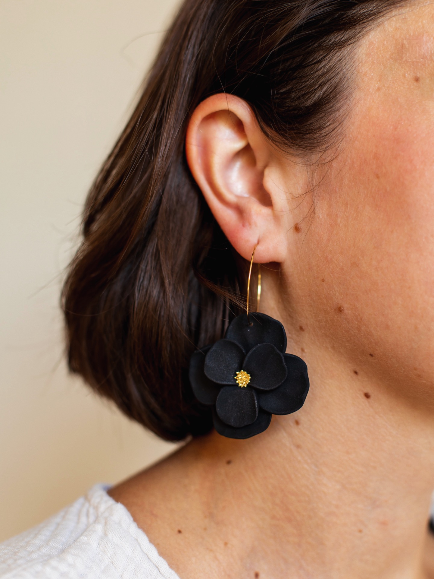 Elegantní a výrazné náušnice ve tvaru květu, které byly ručně vyrobeny z lehké polymerové hmoty. Díky tomu jsou příjemné na nošení, i když působí na uchu výrazně. Květ je doplněn jemným zlatým detailem uprostřed, který dodává šperku luxusní nádech.