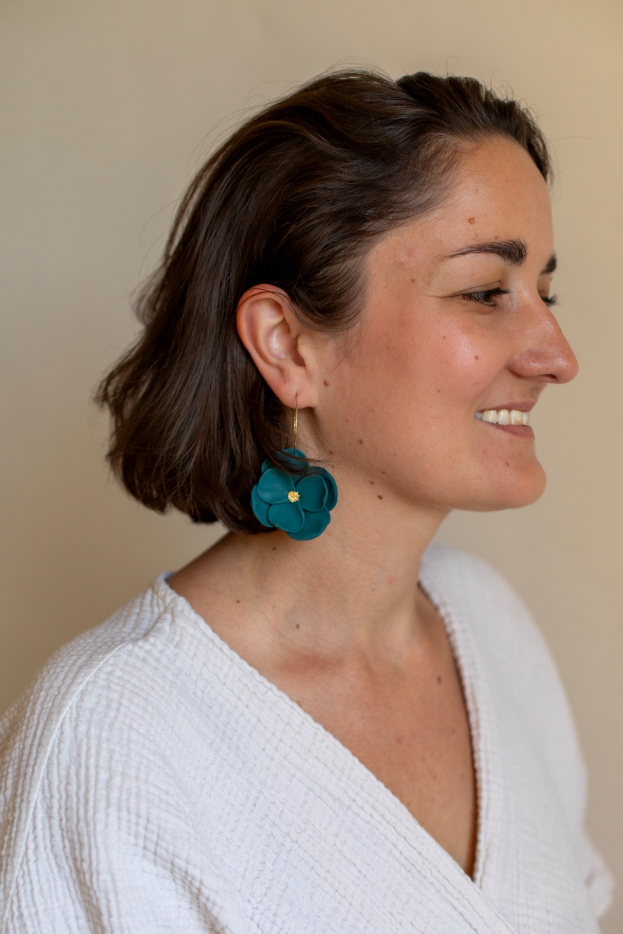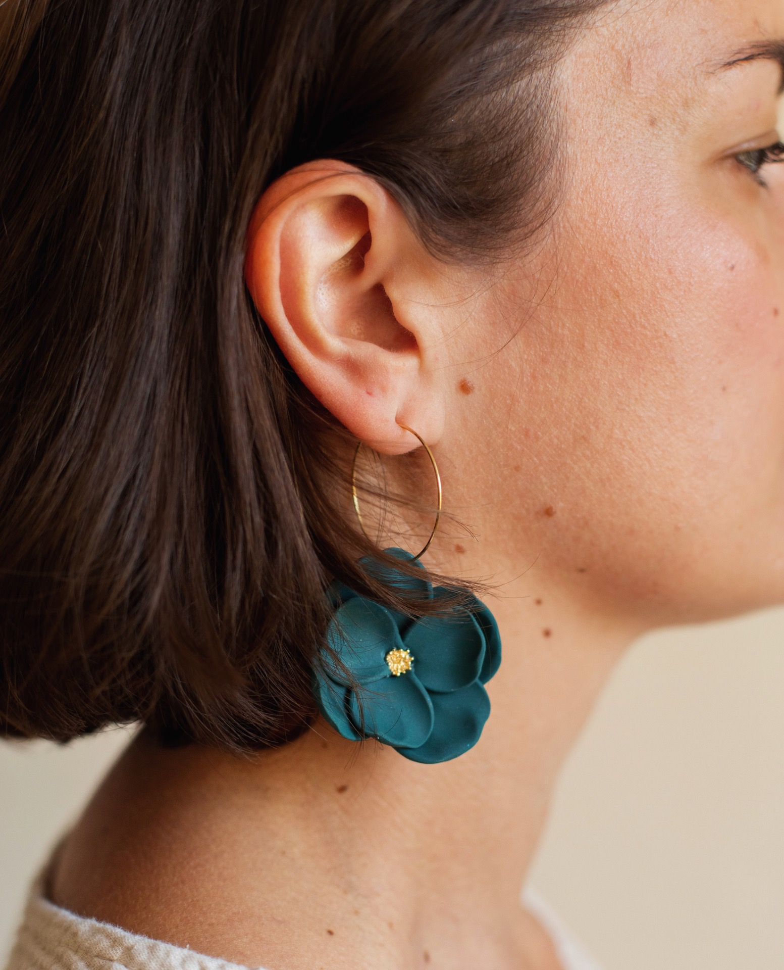 Výrazné náušnice ve tvaru květu v hlubokém tmavě zeleném odstínu. Ručně tvarované z lehké polymerové hmoty, takže se pohodlně nosí, a přesto krásně vyniknou. Zlatý střed dodává šperku decentní eleganci.