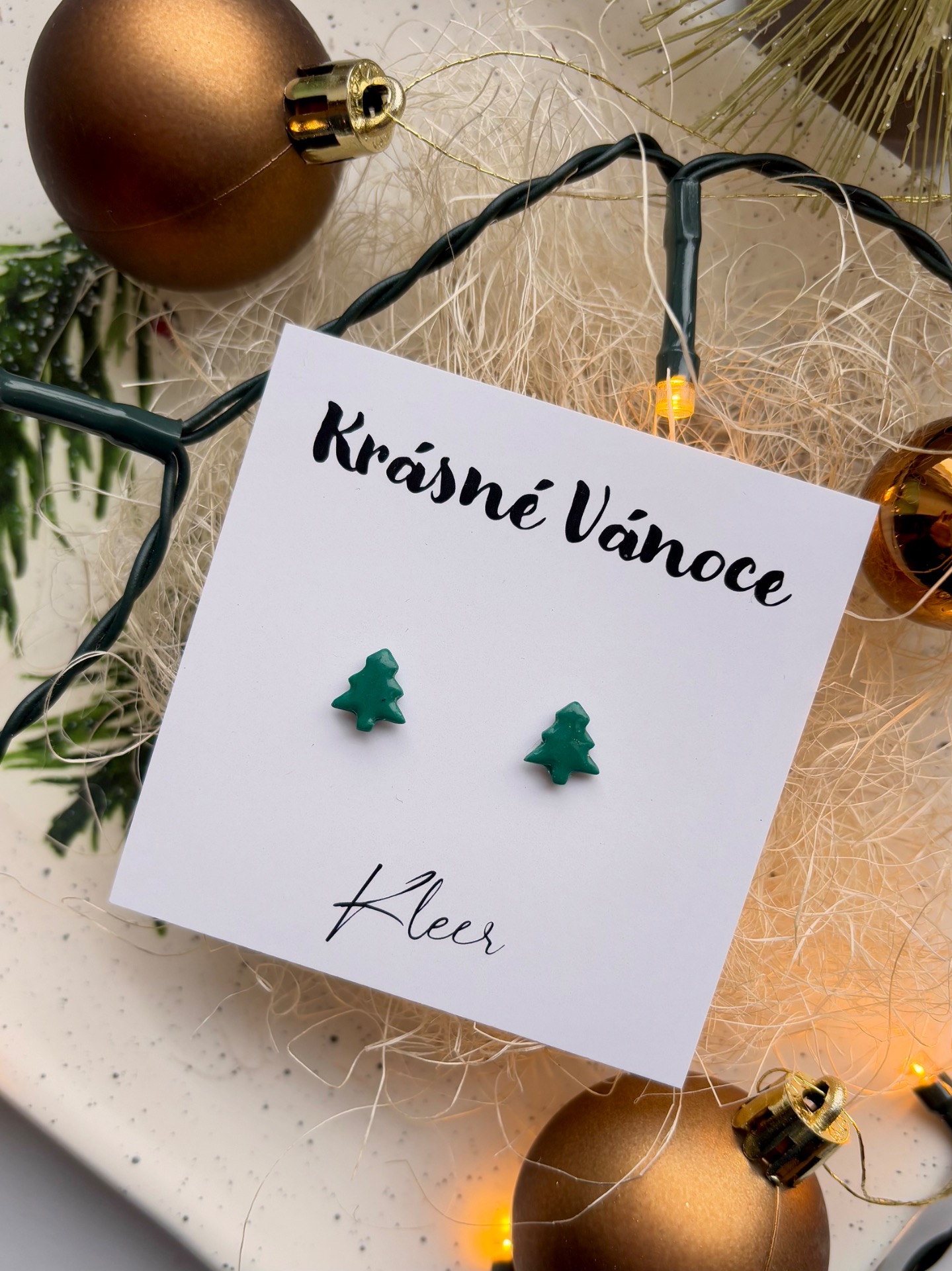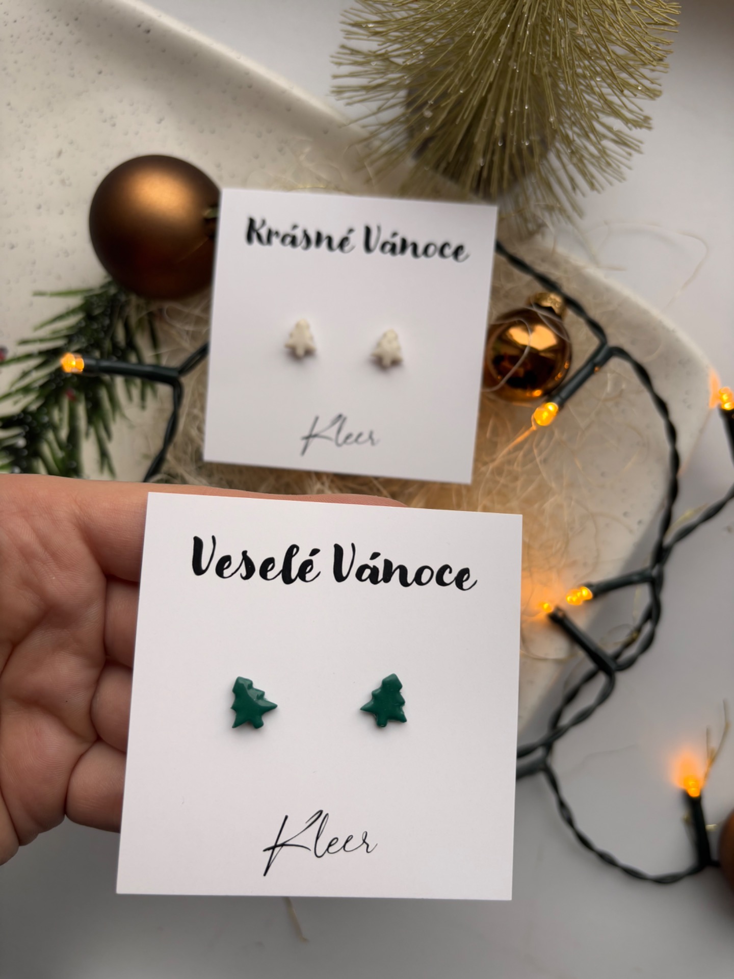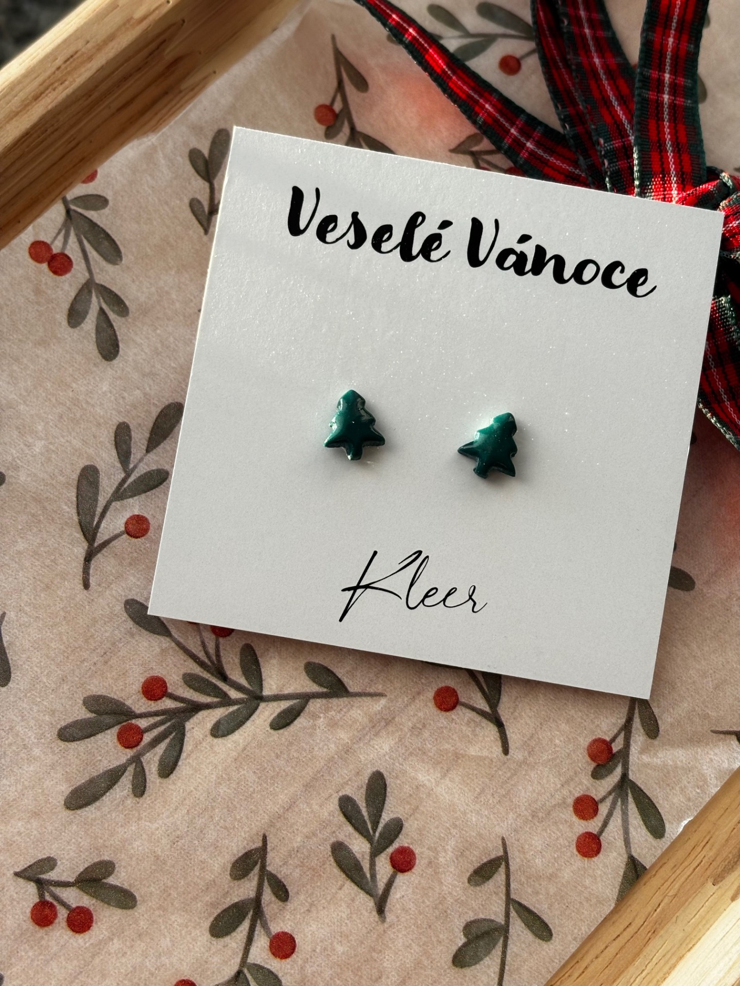 Dolaďte svůj sváteční outfit jemným a minimalistickým šperkem. Tyto ručně vyráběné náušnice ve tvaru malých stromečků jsou vytvořené z kvalitní polymerové hmoty a zalité v křišťálově čiré pryskyřici, která jim dodává odolnost a krásný lesk.