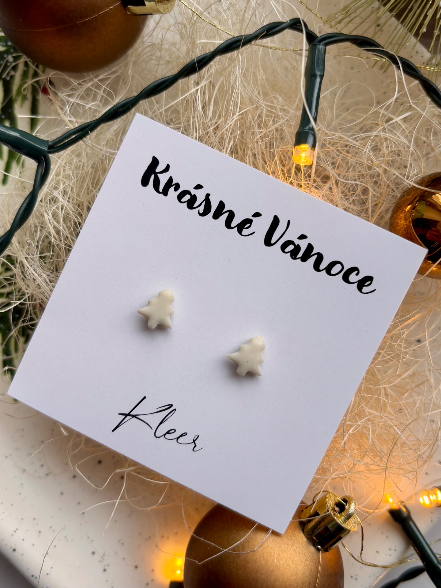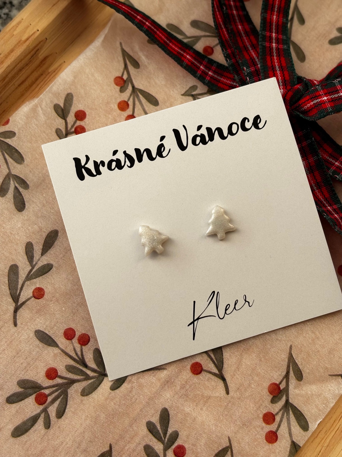 Dolaďte svůj sváteční outfit jemným a minimalistickým šperkem. Tyto ručně vyráběné náušnice ve tvaru malých stromečků jsou vytvořené z kvalitní polymerové hmoty a zalité v křišťálově čiré pryskyřici, která jim dodává odolnost a krásný lesk.