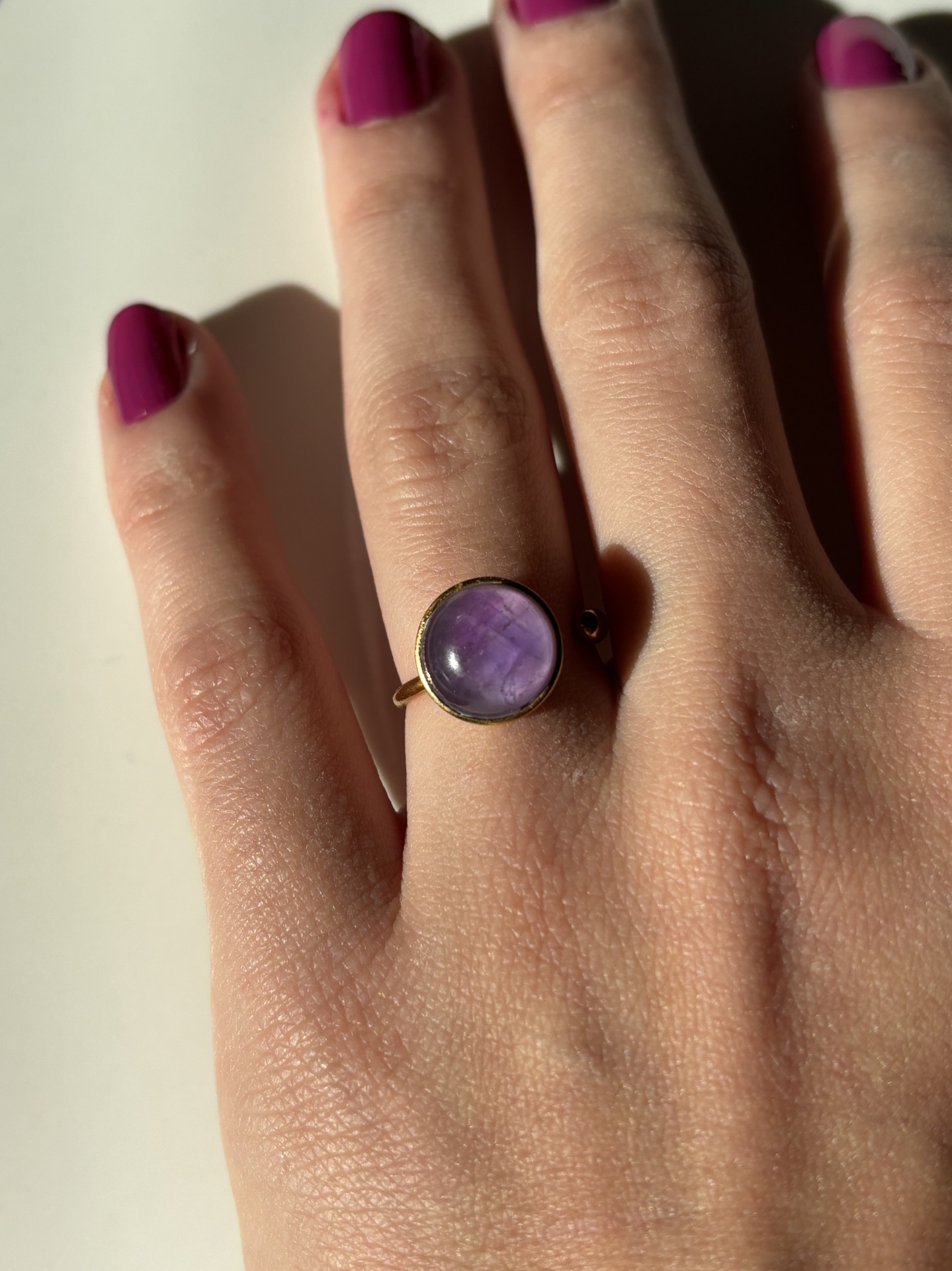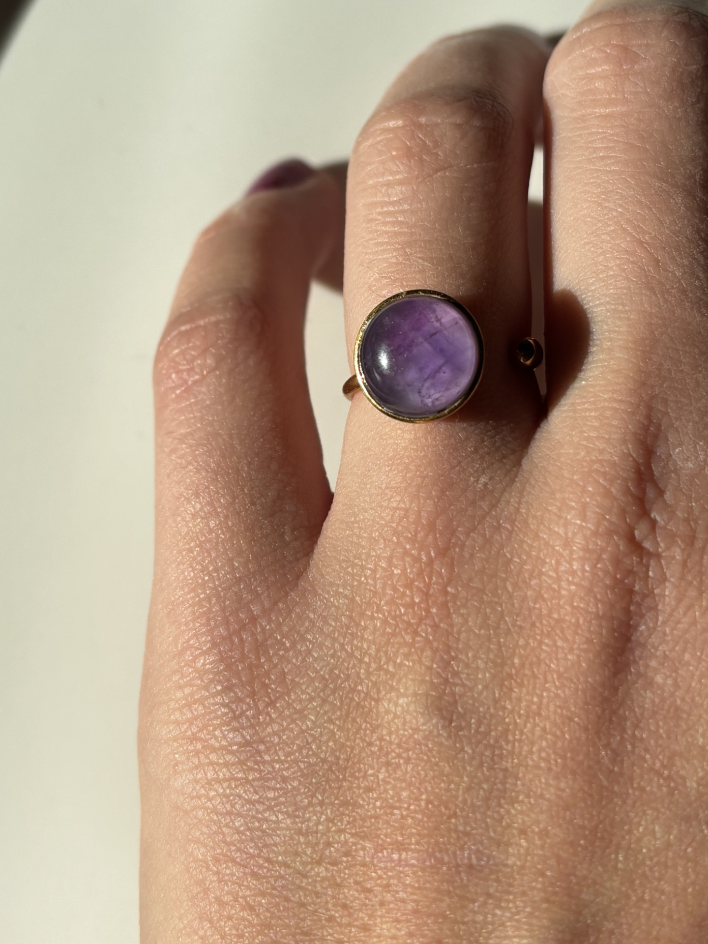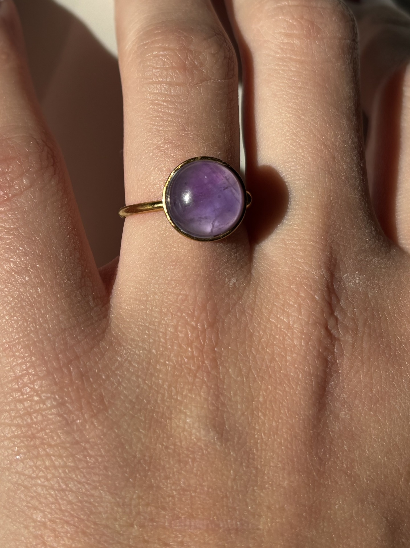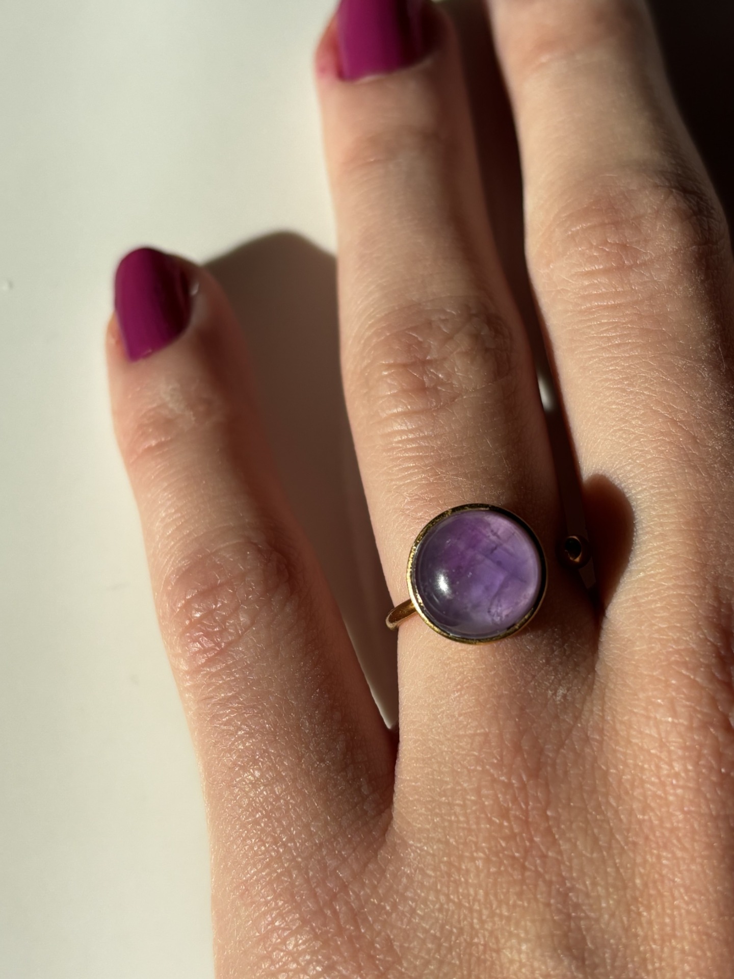 Elegantní prsten z pozlacené chirurgické oceli zdobený přírodním ametystem o průměru 10 mm. Kulatý kámen zasazený v hladké obrubě krásně vynikne díky zlatému tónu kovu a jemnému designu, který působí nadčasově a sofistikovaně.