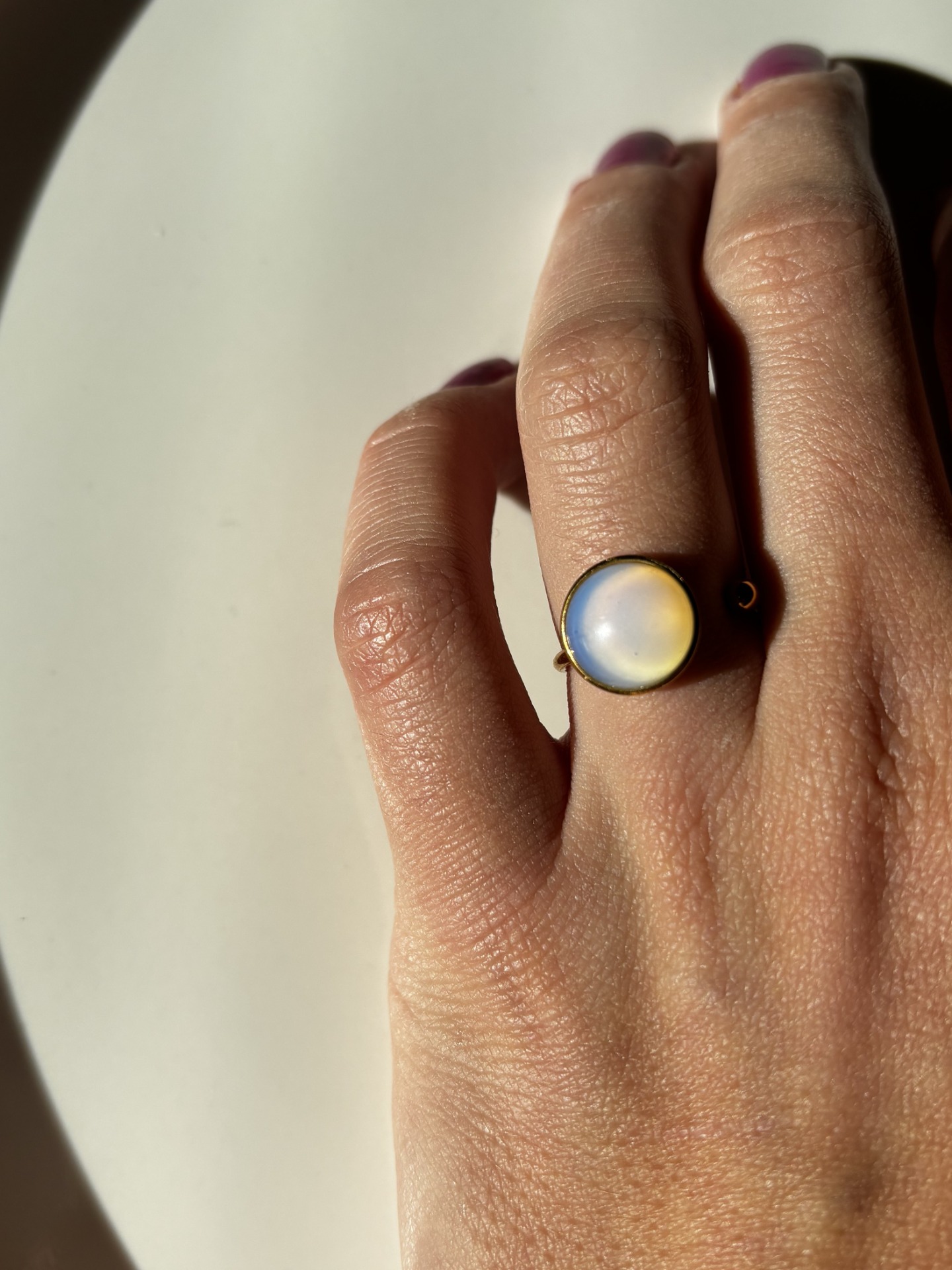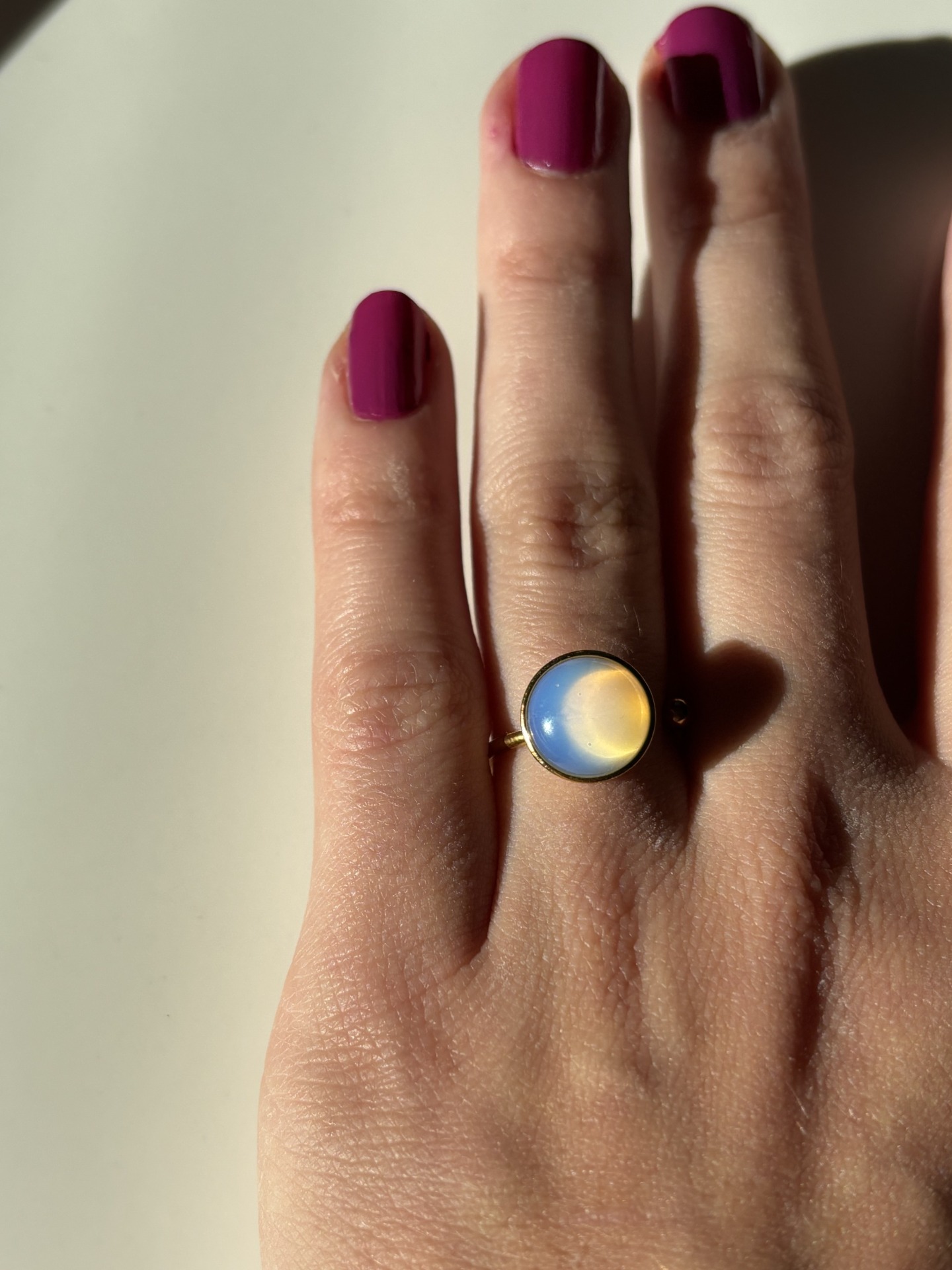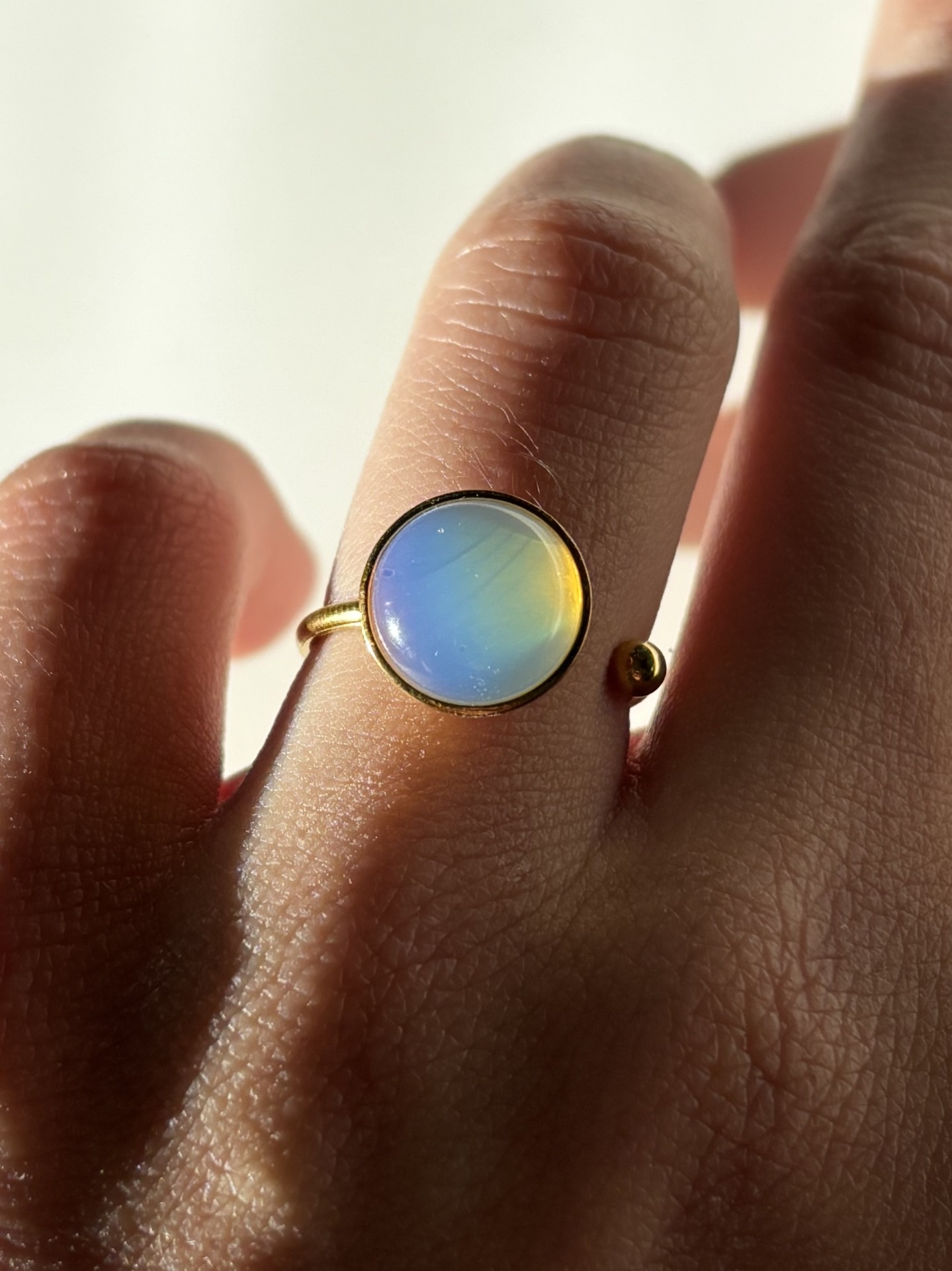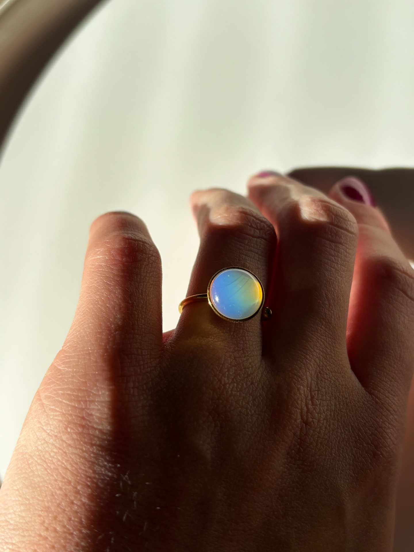 Elegantní prsten z pozlacené chirurgické oceli zdobený přírodním opálem o průměru 10 mm. Kulatý kámen zasazený v hladké obrubě krásně vynikne díky zlatému tónu kovu a jemnému designu, který působí nadčasově a sofistikovaně.