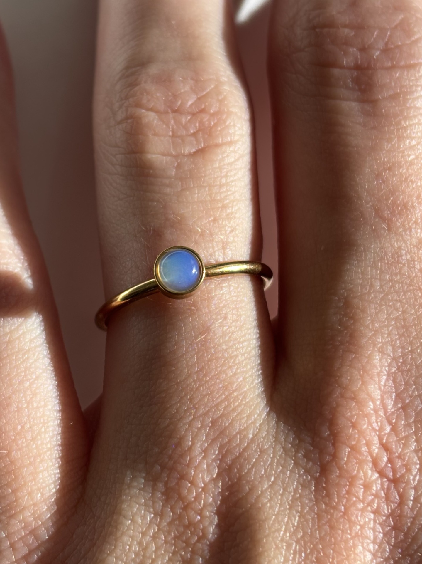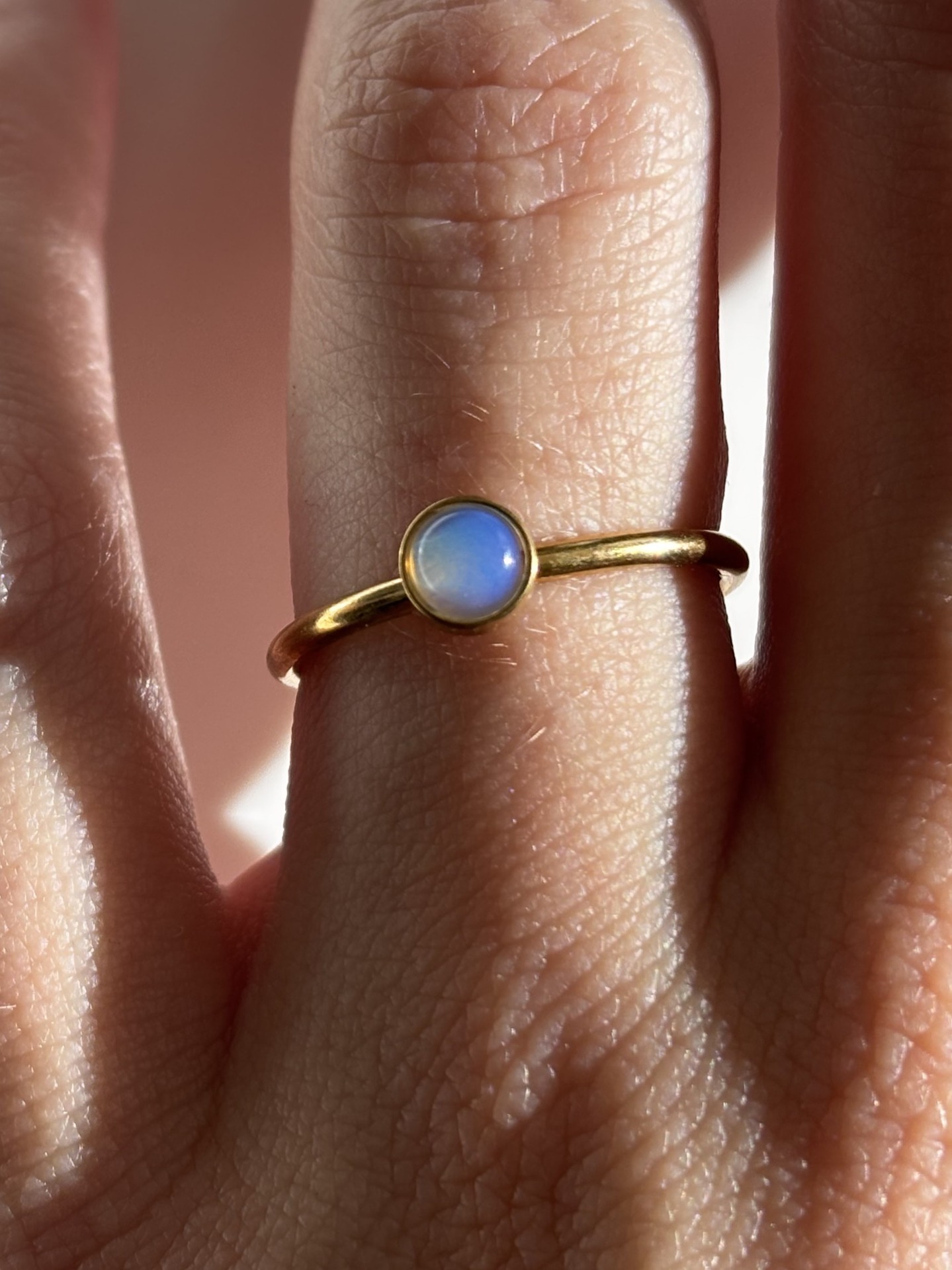 Jemný prsten z pozlacené chirurgické oceli s drobným přírodním opálem o průměru 4 mm. Jeho decentní vzhled doplněný jemným leskem kamene působí elegantně a žensky.